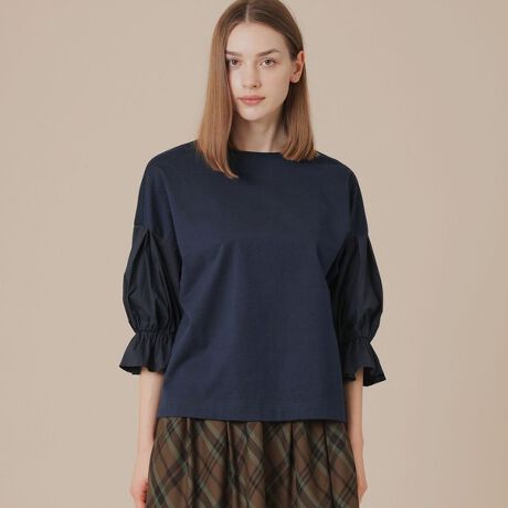 身頃と袖に異素材を組み合わせたマテリアルミックスの六分袖プルオーバーです。ジャージ素材の着やすさと、繊細な生地の風合いを生かしたタックギャザーのボリューム袖がポイントです。袖口はゴム仕様で袖シルエットの調節ができます。
