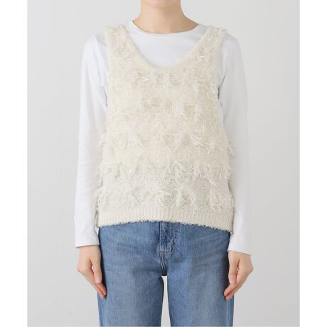 長めのフリンジをランダムに付け、一味違った着映えする1枚に。