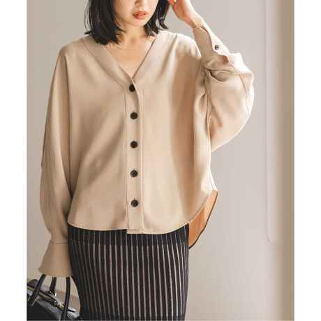 デコルテとの絶妙な襟の開き具合、身体のシルエットを拾いすぎない適度に余裕のあるシルエットが相まって、一枚で着用した際も上品な印象が漂います。