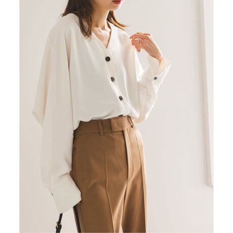 デコルテとの絶妙な襟の開き具合、身体のシルエットを拾いすぎない適度に余裕のあるシルエットが相まって、一枚で着用した際も上品な印象が漂います。