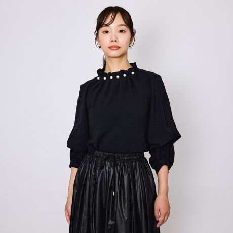 接触冷感、UVカット機能の付いたイミテーションパールアクセントのブラウスです。