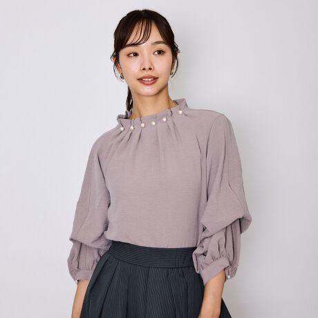 接触冷感、UVカット機能の付いたイミテーションパールアクセントのブラウスです。