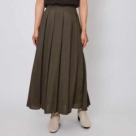 内側に織り込まれたプリーツデザインで着ぶくれ感なく、また、バックウエストはゴム仕様でイージーながら、すっきりとご着用いただけます。