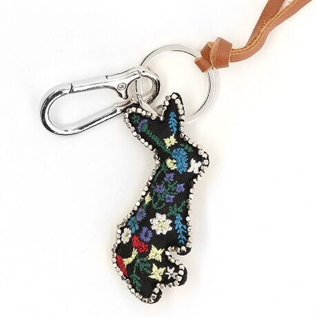 [型番:34030053]ウサギのモチーフチャーム。SUPER HAKKAで好評だったブローチがチャームになって登場しました。縁に施したカットビーズがキラキラとポイントになるデザインです。背面にはロゴ刺繍をあしらいました。大きめのフックと革ひもの両方が付いているので、少し太めの持ち手にも取り付けることが出来ます。お手持ちのバッグやglantaに合わせてご使用いただけます。