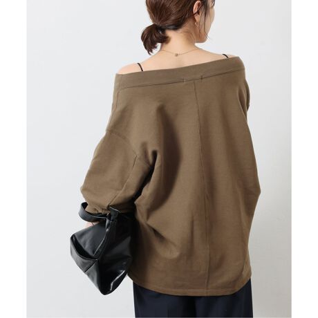 襟ぐりはボートネックになっており、リブ使いで伸縮性があるので、オフショルダーにして着用も可能です。
