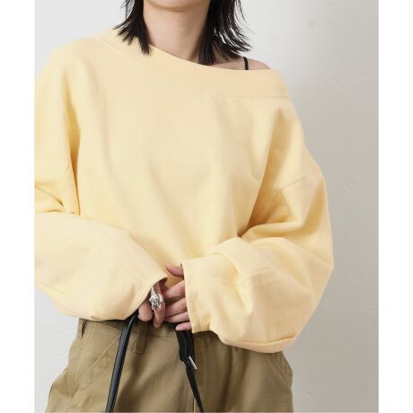 襟ぐりはボートネックになっており、リブ使いで伸縮性があるので、オフショルダーにして着用も可能です。