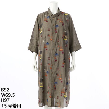 [15〜19号 ]先染めチェックメニーランプ刺繍シャツワンピース(前開き)