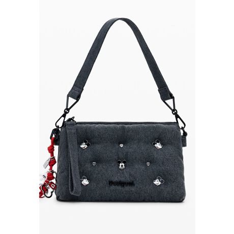 ミッキーマウス型スタッズのディテール、取り外し可能なキーホルダーのディテール、交換可能なハンドルを備えた、キルティング効果のあるデニム生地のショルダーバッグ。