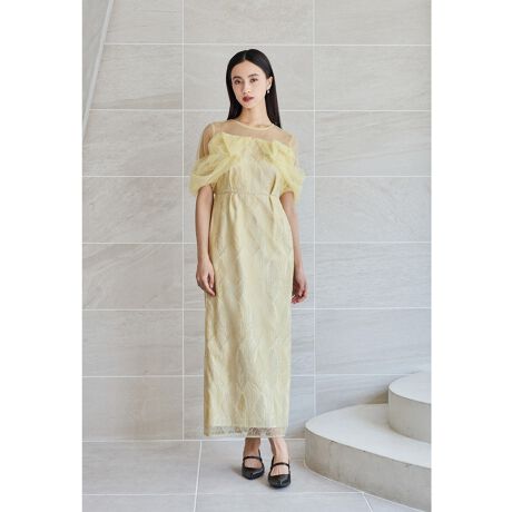 胸元からお袖部分にかけて、オフショルダー風のチュールフリルをあしらいました。