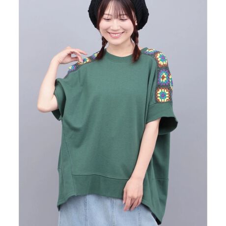 ぽわんと立体感のあるドルマンスリーブに、肩部分にさりげなくクロシェ風モチーフをプラス。