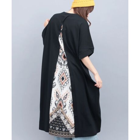 背中のスリットから覗く柄生地が目を惹く、遊び心たっぷりのコンビデザインワンピース。