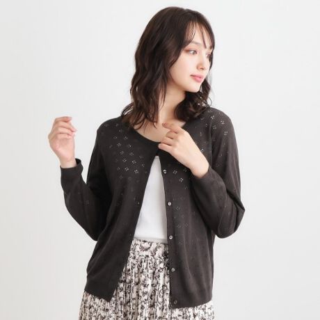 衿元の幾何学模様編みもさり気なく特徴的で、プレーンな編地よりも軽やかで涼しげな印象を与えるアイテムです。