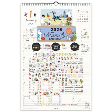 シールもついて家族の予定を楽しく自由に書き込みアレンジできるファミリーカレンダ−です。