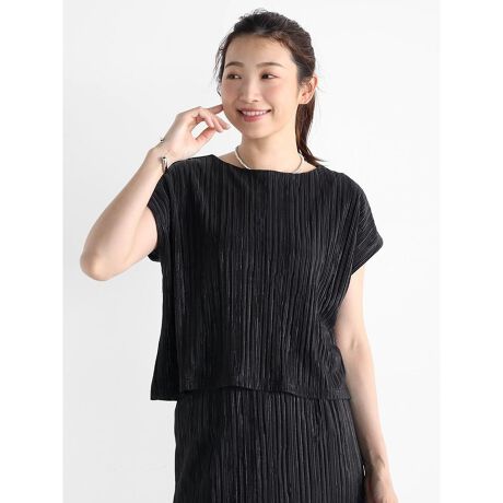 細かなプリーツ生地と存在感のある箔加工が華やかなトップス。