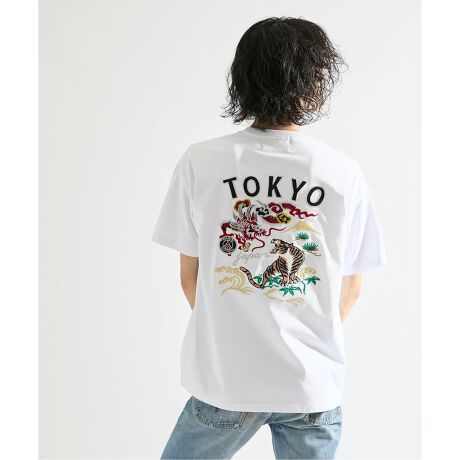 ここで、このTシャツの真骨頂が!バックには、日本の伝統的なデザインである龍と虎、そして富士山が大胆に描かれています。