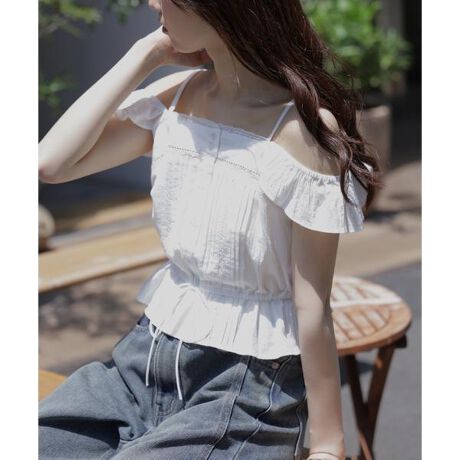 華奢なレースとピンタックが雰囲気のあるキャミブラウス。ヴィンテージライクな粗野で細番手の軽やかなコットン生地を使用。細いストラップは長さ調節できます。フリルスリーブはゴム仕様なので肩に程よくフィット、二の腕まで下げてヘルシーな肌見せも楽しめる2wayデザイン。後ろウエストはゴムとギャザーが入っているペプラムラインで、フロント脇から通したドロストリボンは絞れます。1枚着はもちろん、インナーにコンパクトTシャツやベアトップとレイヤードすると、ビスチェのようにも着こなせます。デニムなどカジュアルなボトムスと相性バツグン。ジャケットのINにもおススメです。※モデルの着用画像の場合、光の当たり具合により、実際の色味と異なって見えることがございます。色味は、商品単体の画像をご参照ください。