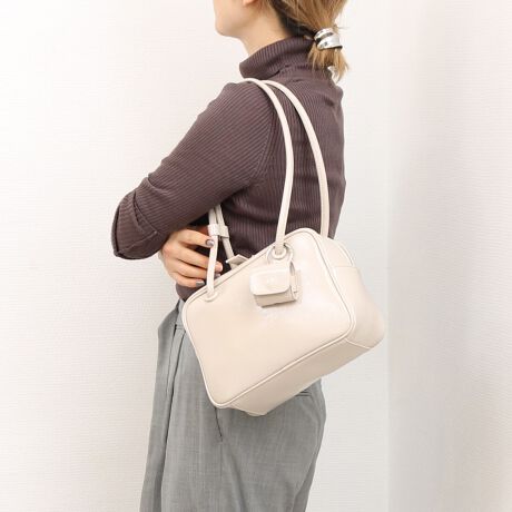 シワ感のあるエナメル、コロンとした形、長めのハンドルとトレンド感を詰め込んだスクエアボストン。
