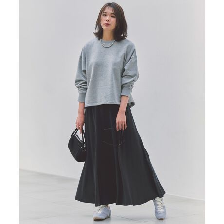 ■デザイン程よい落ち感が上品なギャザーロングスカート。裾に向かって広がるフレアシルエットに、ウエストゴムでリラックスしたはき心地が魅力です。ウエスト内側にドロスト紐が付いているので、フィット感を調整可能。スウェットやニット、ジャケットまで、テイストを選ばず着回しが効くアイテムです。