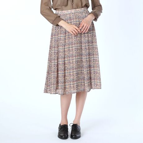 繊細なツイード調プリントがコーディネートの主役になるスカート。さりげないドレープの入ったデザインが、優雅な着こなしを叶えてくれそう。甘くなりすぎないフェミニンスタイルを楽しみたい日にもおすすめの一枚です。