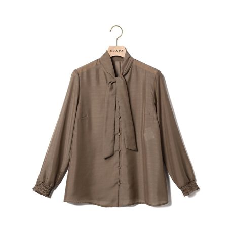 ウィークデイから改まったお出かけまで活躍するボウタイブラウス。微光沢のある上品な生地が、顔まわりを引き立たせるポイントに。くるみボタンやギャザーの入った袖口など、愛らしいディテールも魅力です。