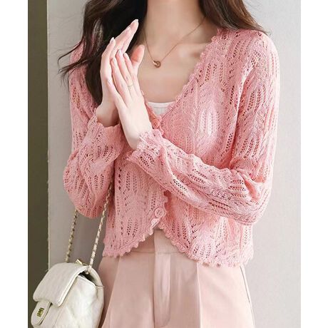 繊細な透かし編みが女性らしさを引き立てる、ショート丈のニットカーディガン。