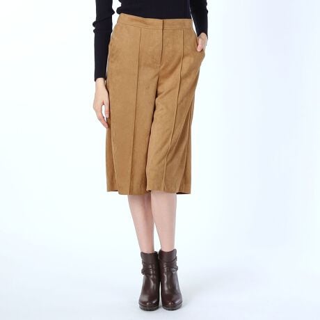 滑らかな質感が上品かつ秋冬シーズンらしさを感じさせる、スエード調ジャージ素材のキュロットパンツ。膝下丈で、タイツやブーツとのコーディネートもお楽しみいただけます。片玉縁のヒップポケットが、仕立ての良さを演出。バックウエストがゴム仕様で、締め付け感がなく疲れにくいのがポイントです。
