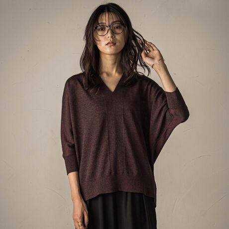 弛むシルエットと、縦を強調したVネックが女っぽいデザイン。