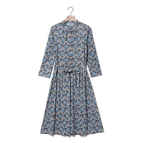 フラワー柄のリバティプリント生地を使用した、袖付きワンピース。トップは前開きのシャツデザインで、包みボタンやタックによる立体感がポイントに。スカートラインはたっぷりと広がり、共布のリボンベルトを結んでクラシカルに着こなせます。シワになりにくい、ポリエステル100%素材です。