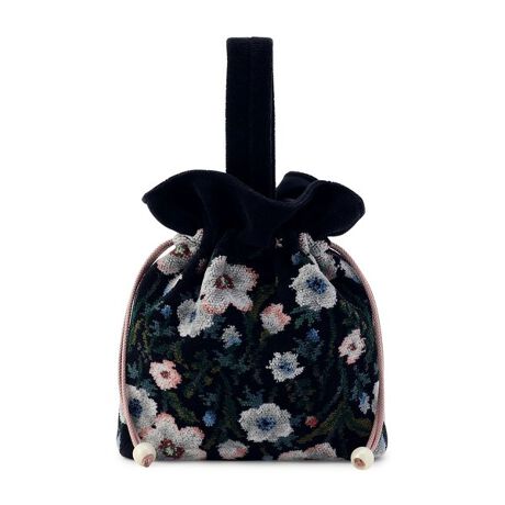 『トワイライトスノー』の巾着バッグです。伸びやかに成長して開花した花々が、ボディ全体に広がる華やかなデザイン。幻想的な柄に合わせて、巾着紐にルーレックス糸を織り込みました。内側にはオープンポケットがあり、必要なものだけを仕分けることも。いつもの着こなしや、ホリデーシーズンのドレッシーな服装にも合わせてお持ちいただけるアイテムです。