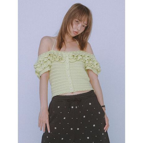 衿ぐりから袖にかけて幾重にも重なるフリルが一際目を引くデザインのニットトップス。ビスチェのようなコンパクトなサイジングで、女性らしいシルエットを強調します。ヘルシーに一枚で着用するのもお勧めですが、シアー感のあるカットトップスとのレイヤードで、さらに洗練されたスタイリングが楽しめます。透け感;なし