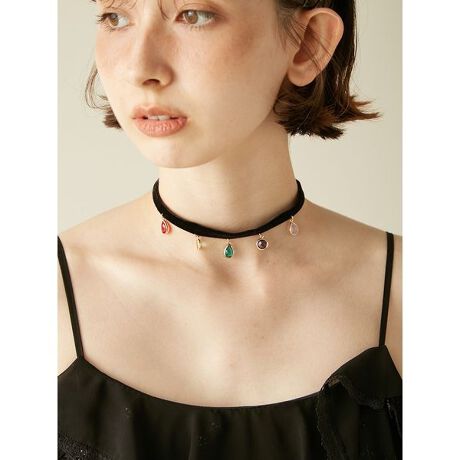 ベロアリボンに、上品なパールとカラーストーンをあしらった2色展開のネックレス。首元にほどよくフィットするチョーカータイプで、カジュアルスタイルのアクセントとしてはもちろん、きれいめな装いにも華やかさを添える万能アイテム。パールタイプはクラシカルに、ストーンタイプはさりげないきらめきで、気分に合わせたスタイリングを楽しめます。