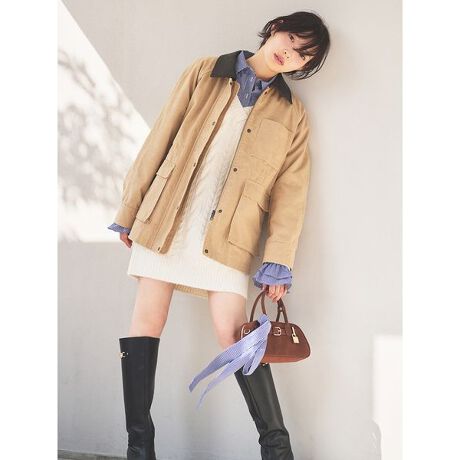 フェイクレザーの衿をドッキングした今季らしいカバーオールジャケット。内側に通したドローストリングでウエストを絞ることもでき、シルエットのアレンジが可能です。メンズライクなデザインをベースにしながら、フェミニンなアイテムと合わせれば抜け感のあるスタイリングに。フリルブラウスやロングスカートとのミックスコーデもおすすめです。
