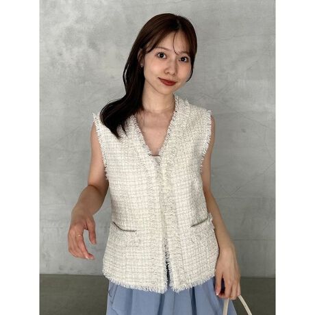 ラメ入りの華やかなツイード素材で仕立てた、ノーカラーのジレです。