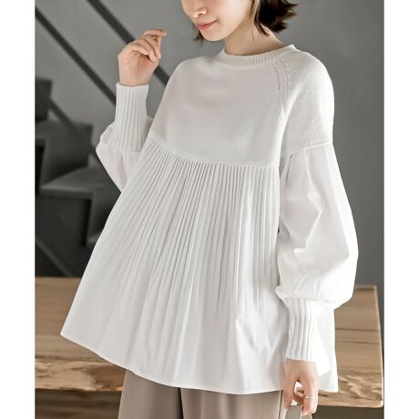 胸から下と袖を異素材で切り替えた贅沢なニットトップス。