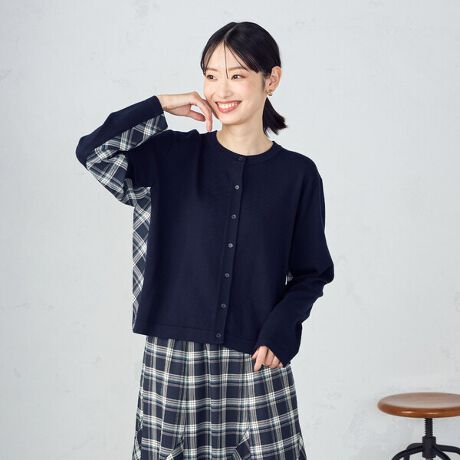 【セットアップ対応】ニットとタータンチェックのコンビネーションカーディガン