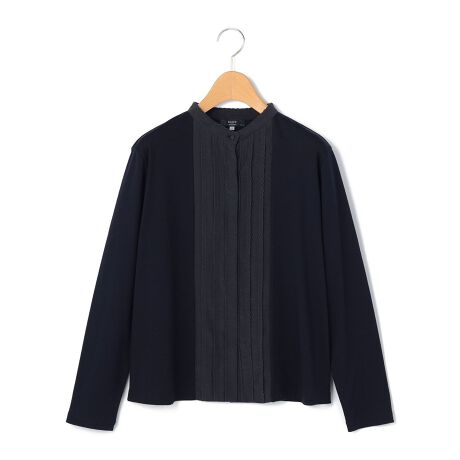 スカラップカットを施した異素材使いがポイントのブラウス。フロントに縦ラインの切り替えを取り入れたことで、スタイルがすっきりと見えるのも特徴です。トレンドのバンドカラーを採用。キレイ目感がありつつも印象が硬くなりすぎず、幅広いシーンで活用できるアイテムです。ちょっとしたお出かけにも適しています。