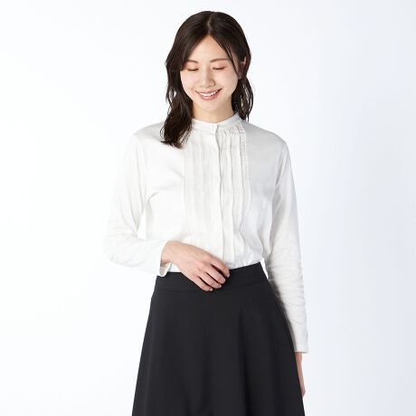 スカラップカットを施した異素材使いがポイントのブラウス。フロントに縦ラインの切り替えを取り入れたことで、スタイルがすっきりと見えるのも特徴です。トレンドのバンドカラーを採用。キレイ目感がありつつも印象が硬くなりすぎず、幅広いシーンで活用できるアイテムです。ちょっとしたお出かけにも適しています。