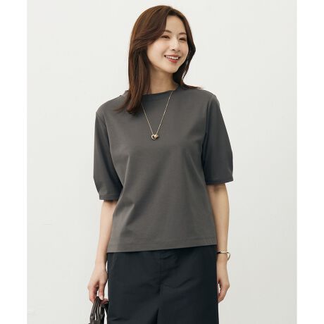 ■デザイン暑い時期にはさらりと1枚で、涼しい時期にはインナーとしても頼れるコンパクトなモックネックカットソー。襟元はやや広めに開いたモックネックで、Tシャツ感覚で着られながらも、大人らしい上品な1着です。程よいサイズ感はジャケットやカーディガンのインにもおすすめです。合わせるアイテム次第で、ロングシーズン活躍してくれる優秀トップスです。カラーは、シックで大人な印象のスレート (#004)、シーンレスに活躍するブラック(#005)、柔らかく女性らしいライトベージュ(#033)、爽やかで凛とした印象のサックス(#073)の4色展開。