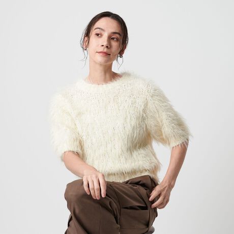 フェザー糸を使用した愛らしい表情が魅力の半袖ニット。