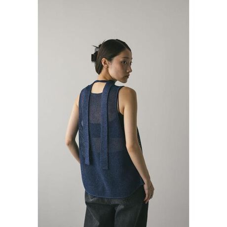 [型番:500IAS70-1321]モデル身長165cm(FREEサイズ着用)ドライタッチのテープヤーンで編み立てたチョーカー付きニットベスト。涼し気ながら秋らしさも感じさせる一枚。シャツやキャミソール、Tシャツなどレイヤードによって様々なスタイリングを楽しめます。透け感あり、ストレッチあり。【お手入れ方法】手洗い可