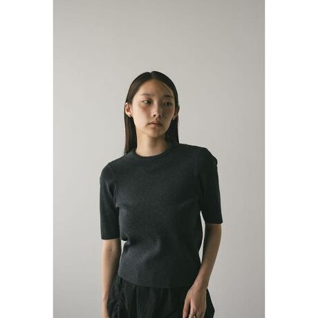 [型番:500IAS70-3231]モデル身長165cm(FREEサイズ着用)ドライなハイツイストコットンで仕立てたモードな上品な5分袖のフォルムニット。袖付けに工夫をこらしたシンプルながら抜け感のある袖周りがポイント。インもアウトもしやすくボトムスを選ばず着用頂きやすい一枚です。透け感なし、ストレッチあり。【お手入れ方法】手洗い可