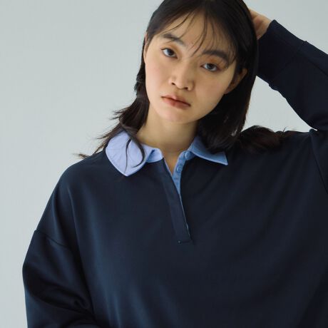 スウェット素材を使用しているので、カジュアルな印象が強くなりやすいアイテムですが、ポロ衿のデザインにすることでスクール風のきちんと感が生まれます。