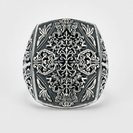 クラシックなシグネットリングをベースに、全面に繊細な透かし模様を施した、贅沢なクラフトリング。古美加工を加えることで、透かし模様の力強さと繊細さが際立ち、まるで時を重ねたアンティークのような深みのある表情に仕上がっています。表面、裏面、側面のすべてに精密な透かしと彫りが施され、どの角度から見ても美しい、360度の完成度。シグネットリング特有の男性的なフォルムに、透かしの繊細さが加わることで、力強さの中にエレガンスが宿る、唯一無二のデザインとなっています。クラシカルでありながら、現代的な感性にも響く一品。日常のスタイルに重厚感を添えたいときや、特別な日のアクセントとしてもおすすめです。※リングの形状により装着時のサイズ感には個人差が生じます。※古美加工は個体差があります。※サイズ直し不可。
