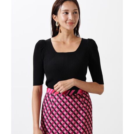 滑らかなニット素材のパフスリーブプルオーバー。控え目な肩タックでパフを表現しているため、甘すぎず、二の腕をさりげなくカバーしてくれます。また、パフと、すっきりした半袖とのコントラストで腕の細さが引き立ち、華奢見えが叶います。ラウンドスクエアカットのネックラインや、身頃のバイアスリブ模様がさらに上半身をすっきりと見せてくれます。スカート、パンツ問わず様々なボトムスと相性が良く、ジャンスカのインナーとしても着まわせる、汎用性の高い1着です。