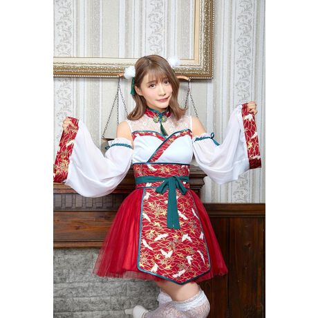 [型番:4560320908920]恋するネオ和装シリーズ「恋衣」。七夕、お月見、雛祭り、桜の季節、お正月どんな和行事にも調和する汎用性の高い、雅なコスチュームシリーズ。鶴の和柄生地にチュールやレース生地、シフォンなど異素材の組み合わせが豪華。ポンポン×タッセルの髪飾りのヘアピンは、クリップピンタイプで付けやすい。