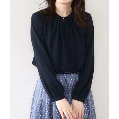 裾をボトムにインしたようなタックデザインがポイントのブラウス。袖はタックアップしやすいようカフスの内側をゴム仕様にしています。