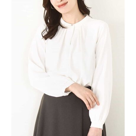 さらりとしたポリエステル素材のブラウスはシワになりにくく、ご家庭で洗える扱いやすさが嬉しい。きちんと感があり、お仕事などのONシーンにもマッチします。透けにくいところも嬉しいポイントです。