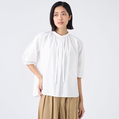 襟元のギャザーが華やかさを添え、お顔まわりを明るい印象にしてくれます。肘が隠れる丈のパフスリーブで上品な印象に仕上げています。裾はラウンドカットで、パンツにもスカートにもバランスよく合わせられるデザインです。