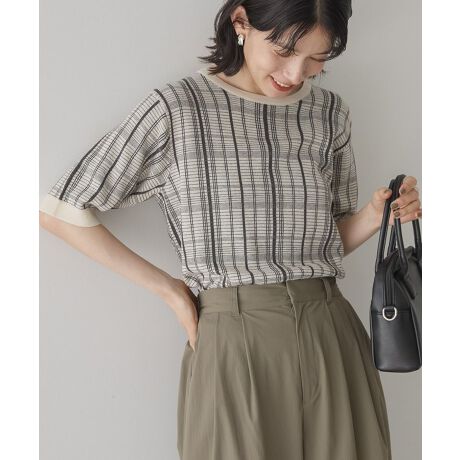 ダブルジャガードのチェック柄が目を惹くニットプルオーバー。程よいふくらみと滑らかな肌触りで着心地良く、やや長めの袖丈が気になる部分を自然とカバーしてスタイルアップを後押しします。ご自宅で洗えるイージーケア仕様なのもポイント。コンパクトな丈感でワイドデニムやフレアスカートなどボリュームのあるボトムとのスタイリングがおすすめです。透け感[なし]