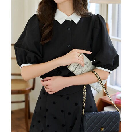 ボリューム感たっぷりのバルーンスリーブにクレリックカラーの配色デザインが目を惹く一枚。